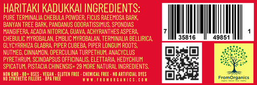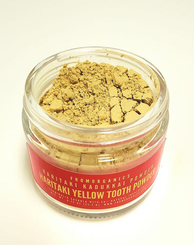 HARITAKI YELLOW TOOTH POWDER may seem like a new way to clean your teeth, but they have actually been used for centuries. Our fluoride-free Tooth Powder combines herbs and minerals renowned for supporting healthy teeth and gums, including Haritaki, Ficus Raeemosa bark, Banyan tree bark, Pandanus Odoratissimus, Spondias Mangifera, Acadia Nitorica, Guava, Achyranthes Aspera, Chebulic Myrobalan, Emblic Myrobalan, Terminalia Bellirica, Glycyrrhiza Glabra, Piper Cubera, Piper Longum Roots, Nutmeg, Cinnamon, Operculina Turpethum, Anacyclus Pyrethrum, Scindapsus officinalis, Elettaria, Hedychium spicatum, Pistacia Chinensis, Cocos Nucifera + 30 More natural ingredients.